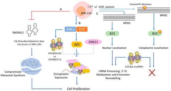 In AML, the chimeric protein, AML1-ETO, is generated by chromosomal translocations, t(8;21) [,]. This protein acts as an oncogene, primarily promoting the self-renewal of hematopoietic progenitor cells []. Its activity relies on the expression of AES (groucho-related amino-terminal enhancer of split), which functions by inducing snoRNA/RNP formation via interaction with the RNA helicase DDX2 [] (Figure 5). The deletion of C/D box snoRNAs SNORD14D or SNORD35A with a concomitant loss of rRNA 2′-O-methylation—both key factors in leukemic stem cell activity—leads to decreased potential for leukemia self-renewal. suggesting that the induction of snoRNA/RNP function constitutes an important pathway in leukaemogenesis []. Although the complete mechanism remains elusive, snoRNAs are associated with 2′-O-methylation and influence the translation efficiency and fidelity of various proteins. Around one-third of AML patients show frameshift mutations in nucleophosmin 1 (NPM1), affecting its role in mRNA processing, ribosome biogenesis, and chromatin remodeling []. These mutations alter NPM1, causing it to localize in the cytoplasm [,]. This altered localization may connect to decreased 2′-O-methylation guided by C/D box snoRNAs in AML cases with NPM1 mutations [] (Figure 5). Npm1 inactivation in adult HSCs results in bone marrow failure. SnoRNAs like SNORD15, SNORD47, and SNORD104 have been shown to play roles in pathogenesis: their inactivation reduces colony formation, while the inactivation of SNORD15, SNORD47, SNORD52 and SNORD58 boosts erythroid cell differentiation. These data demonstrate that individual snoRNAs may have distinct roles in specific biological processes [].