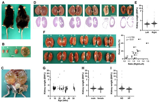 In our previous study on obesity using Tspan7 transgenic mice [31], dilated kidneys were frequently observed in the mice. In mice with severely dilatated kidneys, it was possible to infer that the kidneys were dilated from the bulges in their flank even without dissection (Figure 1A,B). Some mice had only one kidney dilated, whereas in others, both kidneys were dilated (Figure 1C). Among the 480 mice used in this study, one mouse had no left kidney, and its right kidney was dilated. The appearance of kidney abnormalities varied; in some cases, the kidneys were enlarged so much that the renal blood vessels became clearly visible (Figure 1B,C), whereas in others, internal cavities of various sizes were visible upon bisecting the kidney (Figure 1D). When the enlarged kidney was split in half, the fluid that came out was yellowish and ammonia was detected. Hematoxylin and eosin (H&E)-stained kidney section images revealed structural collapse of the kidney parenchyma, including atrophy and dilation of the renal pelvis (Figure 1D), which is responsible for draining urine into the ureter [10]. Dilation often appeared in the right kidney, although a giant left kidney was also occasionally present (Figure 1D). The right kidney weighed significantly more than the left (p < 0.0001; Figure 1E). Upon separating the kidneys into halves, the heavier the right kidney was compared to the left kidney, the more internal cavities were observed (Figure 1F). Kidney dilation was not associated with age (Figure 1G). However, there were differences according to sex and diet; males had heavier kidneys (BW%) than females (p < 0.0001, Figure 1H), and normal diet (ND)-fed mice had heavier kidneys (BW%) than high-fat diet (HF)-fed mice (p < 0.01, Figure 1I).