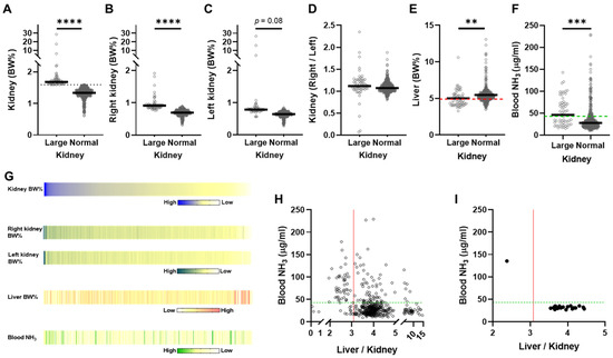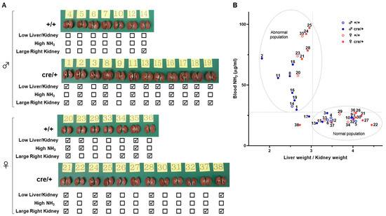 The liver converts nitrogen compounds such as ammonia into urea, which is excreted as urine by the kidneys, indicating a close relationship between the kidneys and liver. Therefore, to determine whether the kidney dilation observed was a result of abnormal liver function, we measured blood ammonia levels in mice in the large- and normal-kidney groups. The blood ammonia concentrations in the large-kidney group were significantly higher than those in the normal-kidney group (p < 0.001, Figure 2F). Furthermore, 52.6% (29 + 2 = 31/59 mice, Table 1) of mice in the large-kidney group had ammonia concentrations ≥41.7 μg/mL (the upper limit of the 95% CI for the mean ammonia concentrations), whereas only 22.8% (42 + 54 = 96/421 mice, Table 1) of mice in the normal-kidney group had concentrations above this level. Notably, 29 (93.5%) of the 31 mice with large kidneys and small livers had high levels of ammonia in their blood, whereas only two of the 28 (7.1%, Table 1) large-kidney mice with normal livers had high blood ammonia levels. Even in normal-kidney mice, 47.2% (42/89 mice, Table 1) of mice with small livers had high blood ammonia levels.