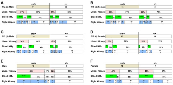 High incidence of hydronephrosis-like pathology in Cre-incorporated mice. The numbers inside the upper columns represent the numbers of mice analyzed for (A) fl/y(X) male, (B) fl/fl(X) female, (C) fl/fl(6) male, (D) fl/fl(6) female, (E) Adipoq-Cre male, and (F) Adipoq-Cre female mice. Pink column (Liver/Kidney): incidence of mice with a liver-to-kidney weight ratio < 3.081; green column (Blood NH3): incidence of mice with a blood ammonia concentration > 42.9 µg/mL; blue column (Right kidney): incidence of mice with a right kidney-to-body weight ratio >0.85. fl/y(X) and fl/fl(X), Tspan7-knockout mice; fl/fl(6), Tspan7-overexpressing mice; cre/+, Cre-positive mice; +/+, Cre-negative mice.