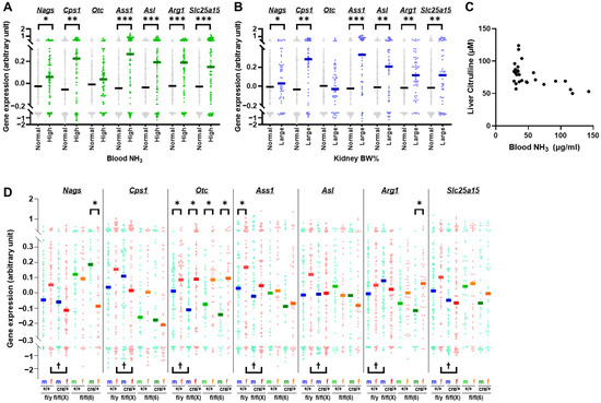 The liver expression profile of Otc differs from that of other urea cycle genes. Comparison of urea cycle gene expression levels between (A) mice with high (n = 104) and normal (n = 376) blood ammonia levels and (B) mice with large (n = 54) and normal (n = 426) kidneys. The statistical significance of the difference among groups was assessed using the Mann–Whitney U test. * p < 0.05, ** p < 0.01, and *** p < 0.001. (C) Liver citrulline and blood ammonia levels. (D) Expression of urea cycle genes in male and female mice, fl/y(X), fl/fl(X), and fl/fl(6) mice, with and without Cre incorporation. The lines indicate the median, and the plots show individual data: blue, male fl/y(X), n = 170; red, female fl/fl(X), n = 151; green, male fl/fl(6), n = 86; orange, female fl/fl(6), n = 73. m, male; f, female; fl/y(X) and fl/fl(X), Tspan7-knockout mice; fl/fl(6), Tspan7-overexpressing mice; cre/+, Cre-positive mice; +/+, Cre-negative mice. The statistical significance of the difference among groups was assessed using the Mann–Whitney U test. * p < 0.05 between male and female mice within the same mouse line and genotype; †, p < 0.05 between +/+ and cre/+ groups within the same mouse line and sex.
