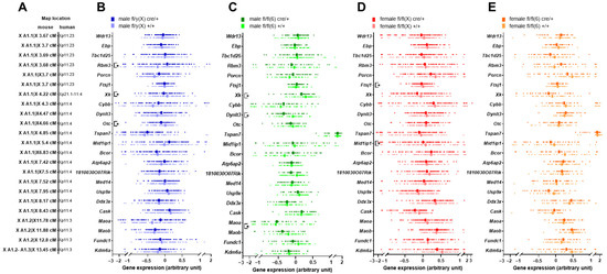 In fl/y(X) male mice, in which Otc expression was significantly reduced upon Cre integration, the expression of the X-linked Kx blood group antigen (Xk) was significantly reduced (p < 0.05, Figure 5B). A significant reduction in Xk expression upon Cre integration was also observed in the fl/fl(6) male mice (p < 0.05, Figure 6C). In addition, in fl/y(X) male mice, the expression of the RNA-binding motif (RNP1, RRM) protein 3 gene (Rbm3) was significantly increased (p < 0.05), and in fl/fl(6) male mice, the expression of the genes encoding dynein light chain Tctex-type 3 (Dynlt3), monoamine oxidase B (Maob), and FUN14 domain containing 1 (Fundc1) was significantly decreased (p < 0.05, Figure 6B,C). In fl/fl(X) female mice, the gene expression levels of FtsJ RNA 2′-O-methyltransferase 1 (Ftsj1) and MID1-interacting protein 1 (Mid1ip1) were significantly reduced (p < 0.05, Figure 6D), whereas none of the genes were affected in fl/fl(6) female mice (Figure 6E).