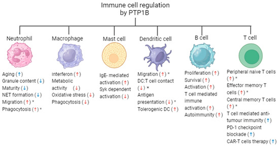 The role of PTP1B in immune cell function. PTP1B regulates the activation and functional properties of both innate and adaptive immune cells. The pharmacological inhibition (↑, ↓) [32,33,34,35] or knockout (↑, ↓) [12,22,29,35,36,37,38,39,40,41,42,43,44,45] of PTP1B can alter their functional properties, as shown by the arrows. The results refer to global knockout unless specified by an asterisk (*), which represents cell-specific knockout.
