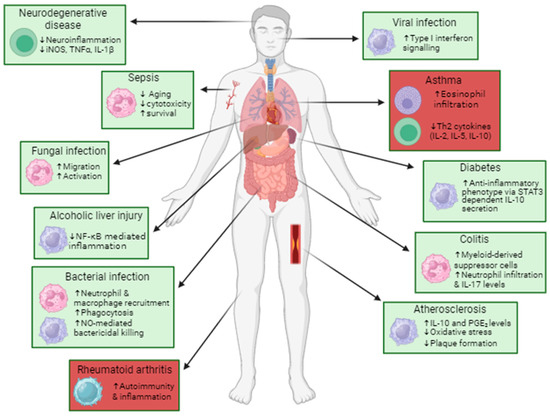 Therapeutic potential of PTP1B inhibition in immune-mediated diseases. Inhibiting PTP1B in immune-mediated diseases could have potential therapeutic effects. It can improve the outcome of disease (in green) by suppressing the pro-inflammatory phenotype of immune cells in autoimmune diseases, or it can help recruit immune cells to the site of infection and promote their activation. This, however, can be harmful in the context of other diseases (in red), exacerbating inflammation and promoting disease progression [25,29,33,36,44,49,57,60,61,62,63,64,65,66,67,68,69,70].