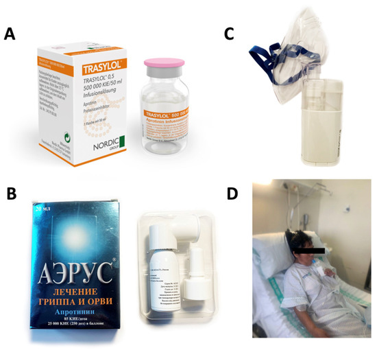 Dispensing forms of aprotinin for inhalational administration. (A) The aprotinin drug Trasylol® for intravenous solution, marketed by Nordic Pharma SAU. In the clinical trial “Aprotinin Treatment Against COVID-19” (ATAC), this medicinal product was prepared for inhalational use by dilution in a 0.9% physiological saline sodium chloride solution to a dose of 500 KIU. (B) The aprotinin medicine Aerus® is conditioned in a pressurised gas inhaler, delivering a dose of ±80 KIU per pulse. It has different types of mouthpieces to allow administration by inhalation or the nasal route. It is marketed in Russia and Eastern European countries by Nixdorf Preventive Health GmbH. (C) An ultrasonic nebuliser device using a vibrating piezoelectric mesh and a mask for delivery. (D) The first patient in the ATAC clinical trial treated with aprotinin using an ultrasonic nebuliser device.
