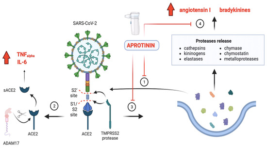 The antiviral activity of aprotinin is due to its non-specific inhibition of host proteases that are required for the proteolytic cleavage of the viral protein S, which is involved in the infectious process of entry through ACE2. In addition, during this entry process, the virus stimulates the increased synthesis, release, and action of many proteases, which will also contribute to enhancing its infective capacity and participate in the inflammatory process. For this reason, selective serine-protease TMPRSS2 inhibitor antiviral drugs have been proposed for the treatment of COVID-19 [57]. However, because they do not target the entire spectrum involved in the infective process of SARS-CoV-2 (e.g., cathepsins, trypsin, fibrinogen, or kallikreins), they have reduced efficacy and do not prevent many aspects of the disease. For this reason, broad-spectrum inhibitors such as aprotinin or α1-antitrypsin have shown greater efficacy than more selective drugs [20,21,58] (Figure 2).