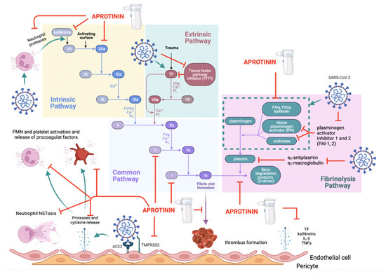 Aprotinin can also prevent other vascular damage factors, such as by inhibition of the production of reactive oxygen species (ROS) by increasing the expression of haem oxygenase-1 [139]; inhibition of iNOS [52,54]; and inhibition of the activation of the thrombin protease-activated receptor (PAR) types 1 and 2 (PAR-1 and PAR-2), whose activation is implicated in tissue remodelling and fibrosis [42,43,44,45]. Finally, it can inhibit processes of platelet adhesion to damaged endothelium by mechanisms that are independent of nitric oxide generation [140]. Secondly, there is a state of hypercoagulation. The pulmonary microvascular thromboses that occur in COVID-19 disease occur largely because of the relationship between the activation of the innate immune system (contact system and complement) and coagulation. This particular type of pulmonary embolism is known as “thromboinflammation” and has a different pathophysiological basis than other vascular embolisms [141]. This is because the presence of viral antigens leads to complement activation [121,122,123], and the viral infection process itself contributes to the release of mediators such as bradykinins, kallikreins, HMWK, plasmin, and coagulation factor XII, which form an active part of the contact system of innate immunity [126]. Both activation of the complement system [134,142] and the contact system [143] contribute to the activation of coagulation pathways in SARS-CoV-2 infection. The contact and complement systems ultimately activate neutrophils by the secretion of proteases such as neutrophil elastase from their azurophil granules, which contribute to the infectious process, inflammation, endothelial damage, formation of Neutrophil Extracellular Traps (NETs) and aggravate, through a vicious cycle, the thromboinflammatory state [144,145]. Indeed, NET formation itself initiates the extrinsic coagulation and contact pathways by releasing tissue factor, thereby triggering factor XII activation and trapping and activating platelets. Patients with severe COVID-19 have elevated serum markers of neutrophil activation and NET formation that correlate with microthrombus formation, which is consistent with these observations [146].