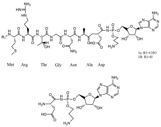 Understanding the structure of Microcin C7 (McC7) is essential for elucidating its antibacterial mechanisms. The structure of antimicrobial peptides (AMPs) is strongly related to their functions. As shown in Figure 1, complete McC7 (Compound 1a) is composed of the MRTGNAD heptapeptide and modified adenosine monophosphate, which are linked to the α-carboxyl group of aspartic acid through an N-acyl phosphoramidite bond. The methionine at the N-terminus of the heptapeptide is formylated, and the phosphate group is modified by an aminopropyl group [40]. Once in sensitive cells, McC7 is treated by deformylase and several peptidases to hydrolyze the formyl group and peptide moiety at its N-terminus, releasing mature McC7 (Compound 2). Mature McC7 targets Asp-RS in bacteria to exert its antibacterial effects [41,84].