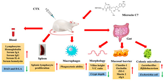 Boosting the innate immunity of the host intestine is a key and feasible way to solve the global problem of bacterial resistance, thus reducing the use of antibiotics [123,124,125,126]. Antibacterial peptides not only inhibit and kill pathogenic microorganisms but also have important immunoregulatory functions and have been recognized as substitutes for antibiotics with high application potential [25,26,27,28]. Dai et al., used a cyclophosphamide-induced immunosuppressed mouse model to explore the effects of the antibacterial peptide McC7 on immunity and intestinal barrier function in mice and elucidated the underlying mechanism involved. The results showed that McC7 relieved weight loss in mice caused by cyclophosphamide and relieved the inhibitory effect of cyclophosphamide on the proliferation of lymphocytes in the spleen and the phagocytosis of peritoneal macrophages in mice in a dose-dependent manner. McC7 significantly reduced the serum D-lactate and diamine oxidase levels and increased the expression of the tight junction proteins ZO-1, Claudin-1, and Occludin and the expression of mucin 1, mucin 2, and secretory immunoglobulin A (sIgA) in the jejunum and colon. McC7 significantly increased the height of the villi and the ratio of villous crypts in the jejunum, decreased the crypt depths in the jejunum and colon, and improved the morphology of the jejunum and colon. In addition, McC7 significantly increased the abundance of Lactobacillus and Bifidobacterium while decreasing the abundance of E. coli in the colon of mice [127].