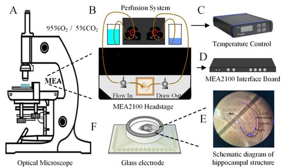 Electrophysiological Recording Process of fEPSPs (A): Optical Microscope (B): Perfusion System Setup (C): Temperature Control Device (D): MEA Interface Board (E): Dorsal Hippocampal Brain Slice (F): Glass Electrode. The MEA electrophysiology experimental platform enables observation and adjustment of the hippocampal brain region using an optical microscope. Oxygen-enriched artificial cerebrospinal fluid is perfused into the groove chamber of the glass electrode via the perfusion system to establish solution circulation. The temperature control device maintains the temperature of the artificial cerebrospinal fluid at a constant 33 °C to simulate the actual brain temperature. Stimulation and signal recording in the hippocampal brain region are controlled by the computer through the MEA system.
