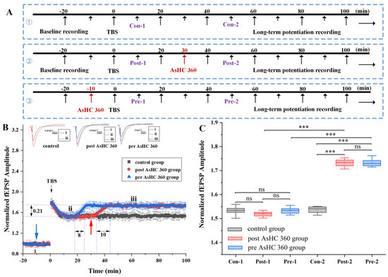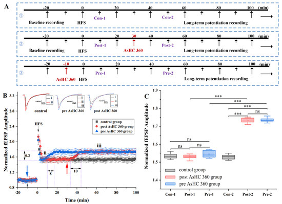 The experimental setup is illustrated in Figure 1. Rat hippocampal slices were placed in the well of a glass electrode chamber (Figure 1F) and positioned on the MEA electrophysiological recording platform (Figure 1A). The MEA electrophysiological recording platform was controlled by computer software to apply high-frequency stimulation (HFS) to the Schaffer-CA1 neural pathway to induce HFS-LTP. The LTP-Director software was used to record the field excitatory postsynaptic potentials (fEPSPs) in the CA1 region of the hippocampus. The experimental protocol is illustrated in Figure 2A. In the control group (without AsHC 360), baseline fEPSPs were recorded for 20 min, followed by recording LTP-fEPSPs for 100 min (total time 120 min). In the post AsHC 360 group, AsHC 360 was introduced via a perfusion apparatus at t = 30 min after the stabilization of the LTP-fEPSPs baseline (baseline recorded for 20 min, followed by 100 min of recording after HFS-LTP induction, total time 120 min). In the pre-AsHC 360 group, AsHC 360 was introduced via a perfusion apparatus at t = −10 min before LTP induction (baseline recorded for 20 min, followed by 100 min of recording after HFS-LTP induction, total time of 120 min).
