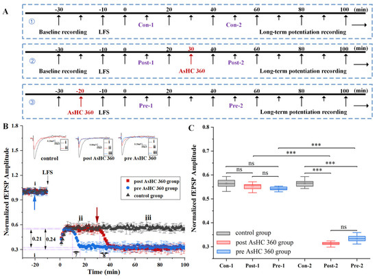 The impact of 15 μg AsL−1 AsHC 360 on LFS-LTD (A): Experimental protocol. ①: control group ②: post AsHC 360 group ③: pre AsHC 360 group (B): Graphical representation of LTD-fEPSPs values for pre AsHC 360 group (blue circle/bars), post AsHC 360group (red square/bars), and control group (black triangle/bars). Blue arrow: Introduction of AsHC 360 in pre AsHC 360 group. Red arrow: Introduction of AsHC 360 in post AsHC 360 group (C): Box plot and one-way ANOVA analysis on LTD-fEPSPs values. (*** indicates p < 0.001, “ns” indicates no significant difference. All groups, n = 5).