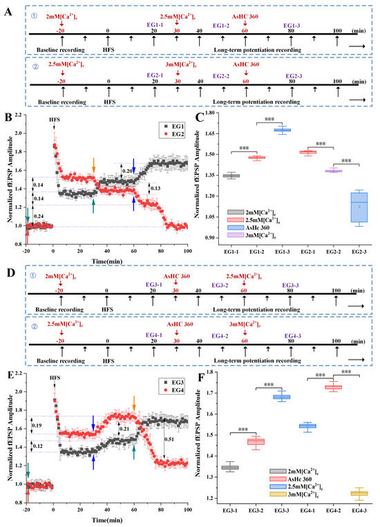 The impacts of varied Ca2+ Concentrations and AsHC 360 on HFS-LTP (A,D): Experimental Protocols (B,E): Electrophysiological Results. Red arrow: Introduction of (2 mM Ca2+) artificial cerebrospinal fluid. Cyan arrows: Introduction of (2.5 mM Ca2+) artificial cerebrospinal fluid. Blue arrows: Introduction of AsHC 360. Orange arrow: Introduction of (3 mM Ca2+) artificial cerebrospinal fluid (C,F): Box plots and one-way ANOVA analysis of LTP-fEPSPs values. (*** indicates p < 0.001, “ns” indicates no significant difference. All groups, n = 5).