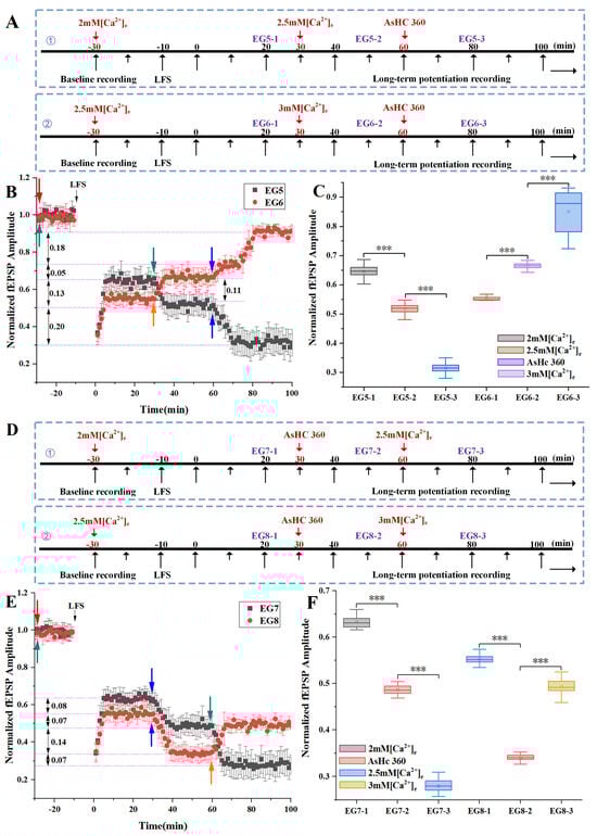 The statistical analysis graph of LTD-fEPSPs is shown in Figure 6F. The results of one-way ANOVA were as follows: EG7-1 vs. EG7-2, p < 0.001; EG7-2 vs. EG7-3, p < 0.001; EG8-1 vs. EG8-2, p < 0.001; EG8-2 vs. EG8-3, p < 0.001. These results affirm significant differences in LTD-fEPSPs among varied ACSF calcium concentrations and AsHC 360 treatments.