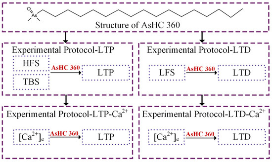 In this section, We investigated the potential impact of AsHC 360 on Ca2+ during the maintenance phase of bidirectional synaptic plasticity. In the gradient experiment comparing different Ca2+ concentrations following the addition of AsHC 360, a significant enhancement in LTP and LTD was observed compared to those without the AsHC 360 group. Based on this phenomenon, we hypothesize that the compound AsHC 360 may enhance bidirectional synaptic plasticity by affecting calcium ion levels. This observation, combined with previous findings by Meyer et al. suggesting AsHCs’ interference with cell membrane integrity [6], and Müller et al.’s indicating of significant local morphological abnormalities and gap formation between cells following AsHC treatment [10], suggests a higher likelihood of AsHC 360 binding to neuronal synaptic cell membrane with increased affinity and bioavailability. Therefore, AsHC 360 may enhance cell membrane permeability (fluidity), thereby expanding the ion channels between intracellular and extracellular environments. This phenomenon might promote Ca2+ influx, with calcium ions mediating the enhancement of bidirectional synaptic plasticity by AsHC 360. The sustained Ca2+ influx activates LTP and LTD protein kinases, thereby increasing synaptic transmission efficiency [29,34]. Thus, this strengthens the maintenance phase of bidirectional synaptic plasticity.