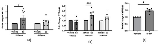 Figure 2. Steady-state CYP19A1 transcript levels in dermal tissue ex vivo and fibroblasts in vitro. (a) Steady-state CYP19A1 mRNA levels 24 and 48 h post-vehicle vs. E2 treatment in healthy donor human skin tissue ex vivo. n = 8 individual samples, two-way ANOVA. (b) Steady-state CYP19A1 mRNA levels 8, 16, or 24 h post-vehicle vs. E2 treatment [10 nM] in human primary dermal fibroblasts. n = 4–5 individual cell lines, two-way ANOVA. (c) Steady-state mRNA levels CYP19A1 24 h post-vehicle (phosphate-buffered saline (PBS)) vs. IL-6+sIL-6R [20 ng/mL] treatment in primary human dermal fibroblasts. n = 5 individual cell lines, paired t-test. Error bars = SEM. * p < 0.05.