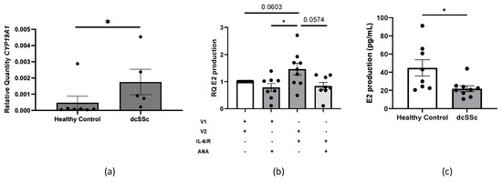 Figure 5. CYP19A1 relative quantity and aromatase enzymatic activity in dcSSc dermal fibroblasts in vitro. (a) Steady-state mRNA levels of CYP19A1 at baseline in primary dermal fibroblasts from healthy donors vs. dcSSc patients. CYP19A1 gene expression was normalized to beta 2 micoglobulin (B2M). n = 6 individual healthy donor cell lines (one healthy control donor measured in duplicate), n = 5 SSc donor fibroblast cell lines, p-value calculated using unpaired t-test after log transformation. (b) Relative quantity (RQ) of secreted E2 produced 96 h post-IL-6+sIL-6R [20 ng/mL] treatment in SSc primary dermal fibroblasts with vehicle or ANA inhibition [300 nM]. n = 6 individual cell lines, 4 measured in duplicate, one-way ANOVA with post hoc analysis. (c) Comparison of E2 production in primary dermal fibroblasts from healthy donors vs. dcSSc patients post-IL-6+sIL-6R [20 ng/mL] treatment and ANA inhibition [300 nM]. Data are relative to fibroblasts treated with their respective vehicles. n = 5 individual cell lines, measured in duplicate. Unpaired t-test. Error bars = SEM. * p < 0.05.