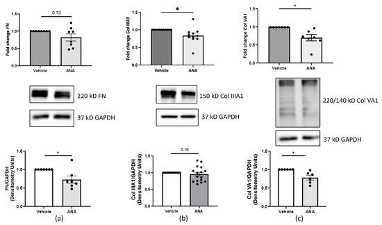 Figure 6. Steady-state ECM transcript and protein levels in ANA-treated dcSSc dermal fibroblasts. FN (top a), Col IIIA1 (top b), and Col VA1 (top c) fold change transcript levels were quantified in primary dermal fibroblasts from dcSSc patients 48 h (a,c) or 96 h (b) post-treatment with ANA [300 nM]. mRNA levels were normalized to GAPDH. Representative immunoblots and densitometry of FN (bottom a), Col IIIA1 (bottom b), and Col VA1 (bottom c) protein levels in primary dermal fibroblasts from dcSSc patients 120 h (a,c) or 96 h (b) post-treatment with ANA [300 nM]. For Col VA1 (c), both the 220 and 140 kD bands were used in the calculation. Protein levels were normalized to GAPDH and presented as fold change. n = 5 individual cell lines used in 6–14 independent experiments. Error bars = SEM. Paired t-test, protein data log transformed, * p < 0.05.