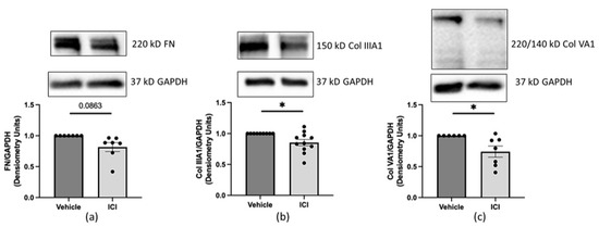 Figure 7. Reduction in FN and type IIIA1 and VA1 collagen protein levels produced by dcSSc dermal fibroblasts after fulvestrant treatment. Representative immunoblots and densitometry of FN and type IIIA1 and VA1 collagen protein levels in primary dermal fibroblasts from dcSSc patients 96 (a,c) or 120 (b) hours post-treatment with fulvestrant (ICI) [100 nM]. Protein levels were normalized to GAPDH. For Col VA1 (c), both the 220 and 140 kD bands were used in the calculation. n = 7 individual cell lines in 7 (a,c) and 11 (b) independent experiments. Error bars = SEM. Paired t-test, * p < 0.05.