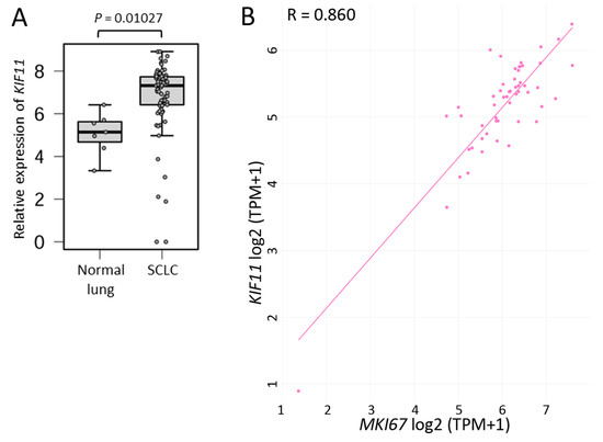 Small cell lung carcinoma (SCLC) tissues have higher KIF11 mRNA expression levels than normal lung tissues. (A) KIF11 mRNA expression patterns in normal lung and SCLC tissues. Expression data from 7 normal lung and 79 SCLC tissues were obtained from a previous report [9]. (B) Correlation between KIF11 and MKI67 mRNA expression levels in 53 SCLC cell lines using data from the Cancer Dependency Map [10]. Pearson’s correlation coefficient (R) = 0.860.