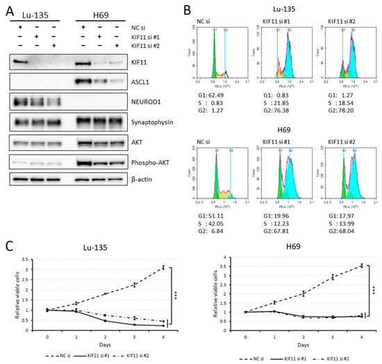 KIF11 knockdown with small interfering RNAs (siRNAs) elicits cell cycle arrest at the G2/M phase in Lu-135 and H69 cells. (A) The Western blot analysis of KIF11, ASCL1, NEUROD1, synaptophysin, AKT, phospho-AKT, and β-actin protein expression in Lu-135 and H69 cells. Cells were reverse-transfected with a negative control (NC) siRNA, KIF11 siRNA #1, or KIF11 siRNA #2 (10 nM each) and cultured for 48 h. (B) The cell cycle analysis of the two SCLC cell lines using flow cytometry. The cells were treated as described in (A). (C) The effects of KIF11 knockdown on the viability of Lu-135 and H69 cells. Cells were reverse-transfected with NC siRNA, KIF11 siRNA #1, or KIF11 siRNA #2 (10 nM each) and cultured for 24 h. Cells (3 × 103) were then seeded in 96-well plates and cultured for another 96 h. Cell viability at days 0, 1, 2, 3, and 4 was assessed in triplicate. The data are presented as the mean ± standard deviation (SD). *** p < 0.001 (at day 4).