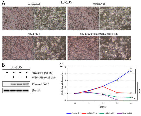 Sequential treatment of Lu-135 cells with SB743921 followed by WEHI-539 markedly decreases cell viability. (A) Phase contrast images of Lu-135 cells treated with WEHI-539 alone, SB743921 alone, a combination of SB743921 and WEHI-539, or neither. Cells were untreated or treated with SB743921 (10 nM) for 48 h, and then were untreated or treated with WEHI-539 (0.25 μM) for another 24 h. Scale bars = 200 µm (left; low magnification) and 50 µm (right; high magnification). (B) The Western blot analysis of the cells treated as described in (A). (C) The cell viability analysis of the treated Lu-135 cells. Cells were untreated or treated with SB743921 (10 nM) for 48 h, and then were untreated or treated with WEHI-539 (0.25 μM) for another 48 h. Cell viability at days 0, 1, 2, 3, and 4 was assessed in triplicate. The data are presented as the mean ± SD. * p < 0.05, *** p < 0.001 (at day 4).