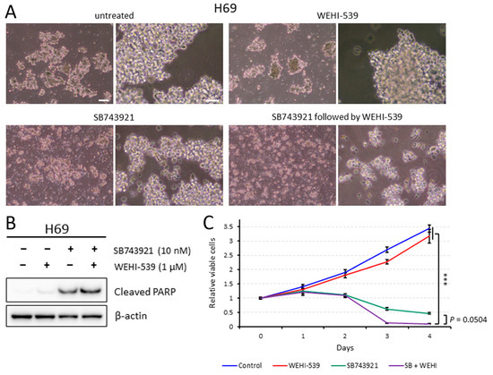 Sequential treatment with SB743921 followed by WEHI-539 is highly effective against H69 cells. (A) Phase contrast images of H69 cells treated with WEHI-539 alone, SB743921 alone, a combination of SB743921 and WEHI-539, or neither. Cells were untreated or treated with SB743921 (10 nM) for 48 h, and then were untreated or treated with WEHI-539 (1 μM) for another 24 h. Scale bars = 200 µm (left; low magnification) and 50 µm (right; high magnification). (B) The Western blot analysis of the cells treated as described in (A). (C) The cell viability analysis of the treated H69 cells. Cells were untreated or treated with SB743921 (10 nM) for 48 h, and then were untreated or treated with WEHI-539 (1 μM) for another 48 h. Cell viability at days 0, 1, 2, 3, and 4 was assessed in triplicate. The data are presented as the mean ± SD. *** p < 0.001 (at day 4).