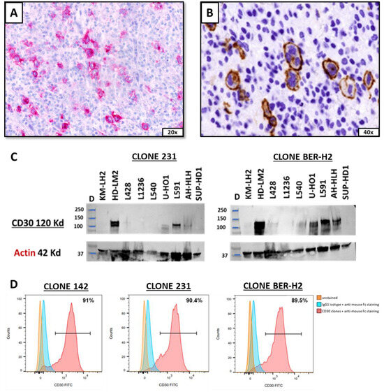 Novel anti-CD30 mAbs were produced through hybridoma technology after BALB/C mice immunization with a 392 amino acid his-conjugated soluble peptide, corresponding to the CD30 extracellular portion. Hybridoma colonies supernatants were initially screened by immunohistochemistry (IHC) on frozen sections of human tonsil. Predicted anti-CD30 clones were identified upon selectively staining a subpopulation of large activated T lymphocytes predominantly located around the mantle areas of the B follicles and, sometimes, inside the germinal centers (Figure 1A). Two distinct anti-CD30 mAbs clones were further selected for strong and specific reactivity against Hodgkin and Reed–Sternberg tumor cells on Hodgkin lymphoma (Figure 1B). Those anti-CD30 clones screened by IHC, named 142 and 231, showed reactivity patterns similar to an already-known anti-CD30 mAb (BER-H2), previously investigated as an immunotherapeutic drug in r/r cHL patients [12].
