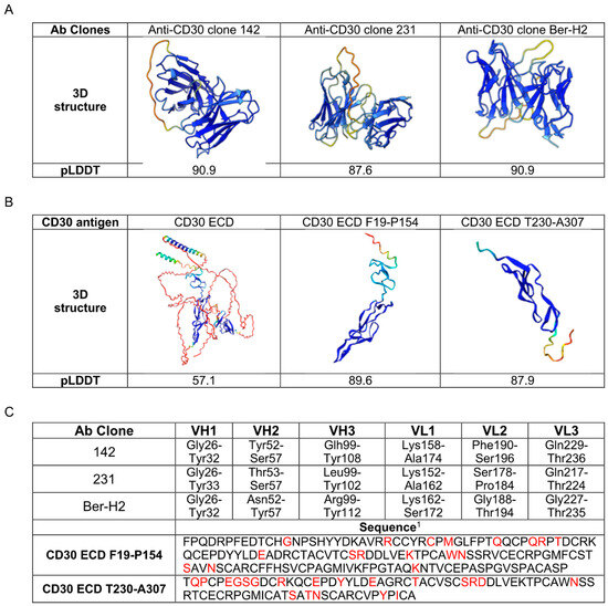 Predicted 3D structures of antibody clones and antigen, and predicted paratope and epitope: (A) Three-dimensional structures of antibody clones and their pLDDT score. (B) Three-dimensional structures of total extracellular CD30 antigen (residues 1-392), CD30 F19-P154 antigen, and CD30 T230-A307 antigen, with their pLDDT score. (A,B) The pLDDT scores are visually represented in AlphaFold models through color-coded intervals. Scores above 90 indicate very high confidence (dark blue), between 70 and 90 represent good confidence (green to cyan), between 50 and 70 reflect low confidence (yellow), and below 50 indicate very low confidence (orange). (C) Prediction of VH and VL chain of different clones, and epitope prediction of the two CD30 ECD regions. Predicted residues as marked in red.