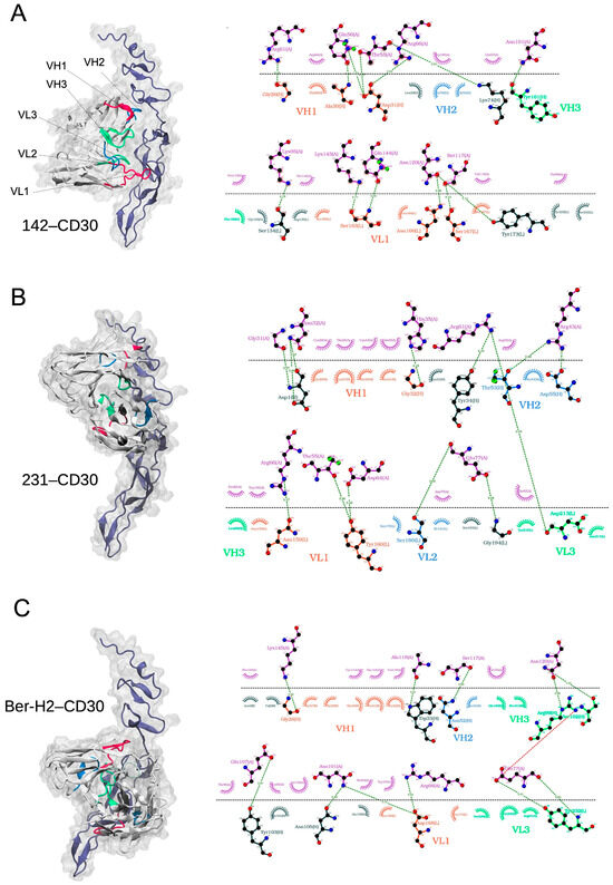 Docking model interaction between CD30 and the three different antibody clones: Contact surface of CD30 in complex with clone 142 (A), clone 231 (B), and clone Ber-H2 (C), and corresponding two-dimensional diagram of the interaction. The docking model indicated 13 intermolecular hydrogen bonds in the 142–CD30 complex, 13 intermolecular hydrogen bonds in the 231–CD30 complex, and 11 intermolecular hydrogen bonds in the Ber-H2–CD30 complex.