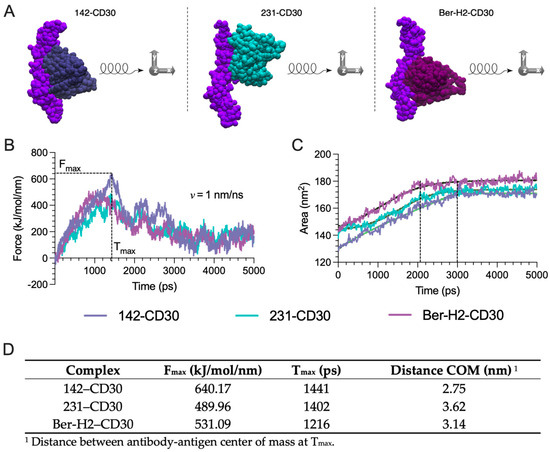 Here, we carried out coarse-grained SMD simulations (CG-SMD) to pull 142, 231, and Ber-H2 clones from the binding region of CD30 antigen as well as pulling CD30 antigen from the binding region of 142, 231, and Ber-H2 clones. By pulling on the COM of the antibody, force builds up until a breaking point is reached, at which time critical interactions are disrupted, allowing the antibody to dissociate from the CD30 antigen structure. We applied an external pull force of 1000 kJ mol perpendicular to the antibody–antigen interface and a soft constrain force (100 kJ mol) on the antigen’s backbone to prevent the antigen conformation from undergoing unfolding or being pulled (drifting) with the antibody during the pull process. The pulling direction was in the XYZ-direction with respect to the vectors connecting COMs of the antigen and antibody (Figure 5A).