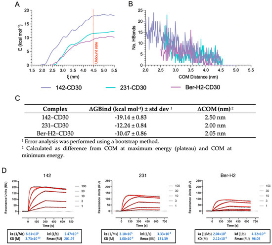 The analysis of the resulting PMF curves showed that the energy minimum occurred at a COM distance of 1.97 nm, 2.66 nm, and 2.43 nm for the 142–CD30, 231–CD30, and Ber-H2-CD30, respectively (Figure 6A). As antibody–antigen interactions decrease in the unbound state, the potential of mean force profiles for each complex tends to approach a plateau and full convergence. After 4.5 nm for the 142–CD30, for the 231–CD30, and for Ber-H2-CD30 (Figure 6A, dotted line), the antigen–antibody complexes are in the unbound state. This state is primarily a result of the loss of hydrogen bonds between the surface of the antibody and the antigen at the interacting interface (Figure 6B), confirming the COM distance in the unbound state observed in the PMF curve. During the binding time, the 142–CD30 complex exhibited a higher number and higher interaction time of hydrogen bonds, in contrast to the 231–CD30 and Ber-H2–CD30 complexes, which had fewer hydrogen bonds and a rapid drop in their number (Figure 6B). Overall, the data indicate that the 142–CD30 complex showed the maximum energy (−19.14 kcal mol−1), followed by the 231–CD30 (−12.24 kcal mol−1) and Ber-H2–CD30 (−10.47 kcal mol−1) complexes (Figure 6C).