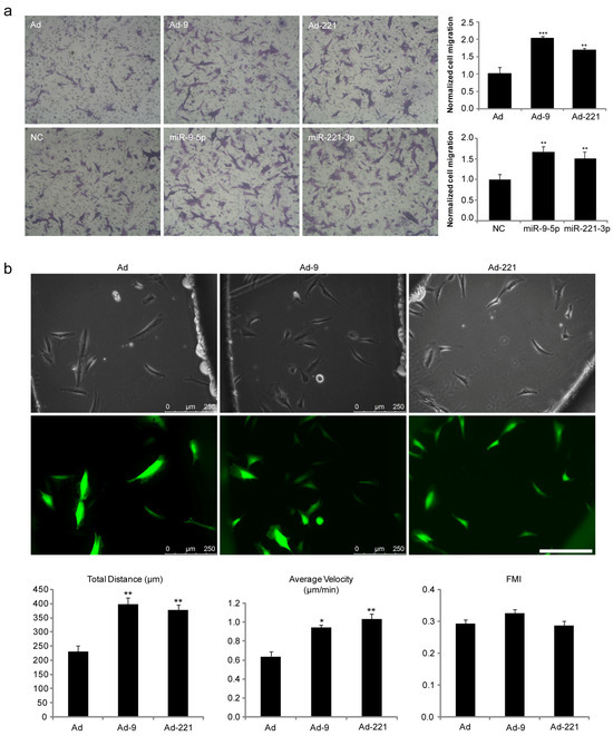 Next, we visualized the migratory behavior in response to HGF using a Dunn chamber under time-lapse video microscopy (Figure 1b, Supplementary Videos S1–S3). As shown in Figure 1b, the average distance and the average migration speed were significantly higher in hMSCs overexpressing miR-9-5p or miR-221-3p, while the forward migration index (FMI), which reflects the directional persistence of cell migration, exhibited little variance, suggesting that miR-9-5p and miR-221-3p promote the motility but not the directional persistence of hMSCs.