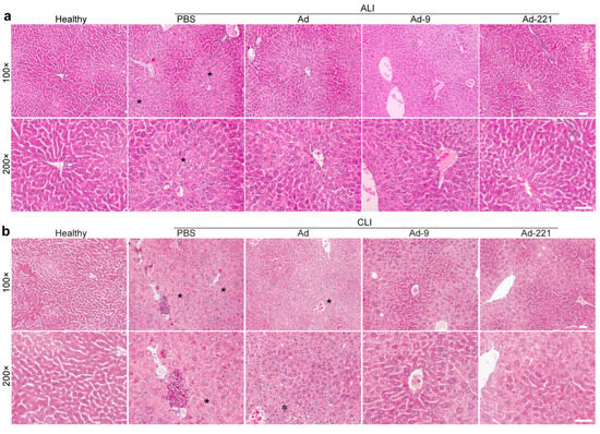 hMSCs overexpressing miR-9-5p or miR-221-3p improved hepatic microscopic architecture. Healthy mice or mice with CCl4-induced acute (a) and chronic (b) liver injury that received PBS or hMSCs for 7 d were cryosectioned and stained with hematoxylin and eosin (n = 5 per group). Asterisks show zonal centrilobular hepatocyte necrosis. Scale bar = 100 μm.