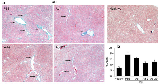 Upon injury, hepatic stellate cells (HSCs), the resident mesenchymal cells located in the space of Disse in a quiescent state in an intact liver, transdifferentiate into an activated myofibroblast-like phenotype and produce ECM to initiate a tissue repair mechanism, but eventually lead to fibrosis or even cirrhosis in case of persistent injury [28,29,30]. As the definitive marker of activated HSCs, α-smooth muscle actin (α-SMA) was upregulated in the vascular walls around the central vein and portal tracts upon acute injury but decreased after infusion of hMSCs for 7 d; a further decrease occurred upon infusion of hMSCs overexpressing miR-9-5p or miR-221-3p (Figure 5a), suggesting less activation of HSCs.