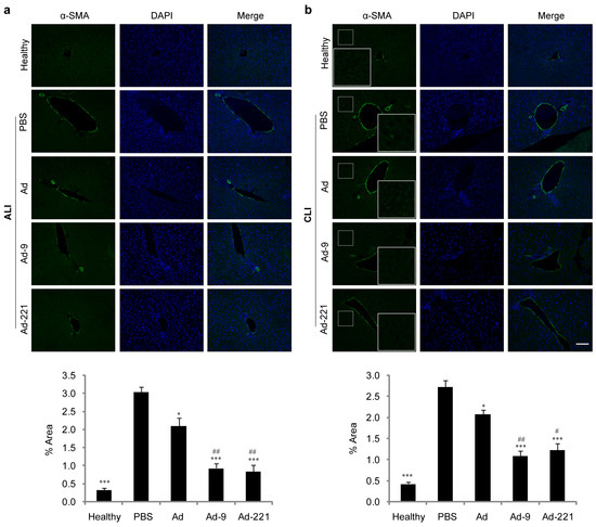 hMSCs overexpressing miR-9-5p or miR-221-3p suppress HSC activation after peripheral infusion for 7 d. Shown are representative images of α-SMA-positive cells (green, scale bar = 100 μm) based on immunofluorescence staining of α-SMA in acutely (a) and chronically (b) injured livers (n = 5 per group). High magnification views in insets show the expression of α-SMA in the perisinusoidal space of hepatic parenchyma. α-SMA expression was quantified using ImageJ software 1.54. Data are shown as mean ± SEM from at least three independent experiments (* p < 0.05, *** p < 0.001, compared with PBS; # p < 0.05, ## p < 0.01, compared with Ad).