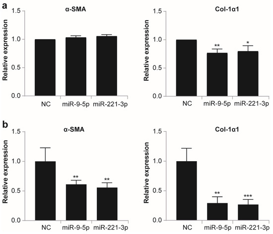 In our efforts to delineate the underlying mechanism, we found that the expression of α-SMA, which is upregulated upon liver injury and indicates the activation of HSCs, was further downregulated when receiving hMSCs overexpressing miR-9-5p or miR-221-3p (Figure 5), suggesting that inactivation of HSCs mediates the alleviation of liver injury by miR-9-5p- or miR-221-3p-modified hMSCs. Although in vitro treatment with CM from hMSCs overexpressing miR-9-5p or miR-221-3p failed to decrease the mRNA level of α-SMA and reverse the activated phenotype of human stellate cell line LX-2, the mRNA level of Col-1α1 was significantly downregulated compared to control CM (Figure 6a), indicating that hMSCs overexpressing miR-9-5p or miR-221-3p may alleviate liver fibrosis via their paracrine factors to disturb the expression of procollagen in activated HSCs. Moreover, upregulation of miR-9-5p or miR-221-3p in LX-2 significantly decreased the expression of α-SMA and Col-1α1 (Figure 6b), suggesting that direct action of miR-9-5p and miR-221-3p may partially mediate the improved therapeutic efficacy of hMSCs overexpressing miR-9-5p or miR-221-3p.