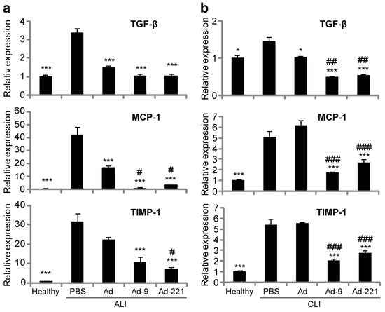 Transforming growth factor β (TGF-β), tissue inhibitors of metalloproteinases 1 (TIMP-1), and monocyte chemotactic protein 1 (MCP-1), which function as either fibrogenic or proinflammatory factors that orchestrate HSC activation and participate in the progression of liver disease, were found to be significantly upregulated in the liver upon acute or chronic injury (Figure 7), as previously reported [29,31,32,33,34,35]. In animals with acute injury, administration of hMSCs decreased the expression of TGF-β and MCP-1, but not of TIMP-1, while hMSCs overexpressing miR-9-5p or miR-221-3p dramatically decreased the expression of all three factors (Figure 7a). In animals with chronic injury, hMSCs only decreased the expression of TGF-β, while again, hMSCs overexpressing miR-9-5p or miR-221-3p remarkably decreased all three factors (Figure 7b). These results suggest that the downregulation of TGF-β, MCP-1, and TIMP-1 contributes to the alleviation of liver injury via the overexpression of miR-9-5p or miR-221-3p in hMSCs.