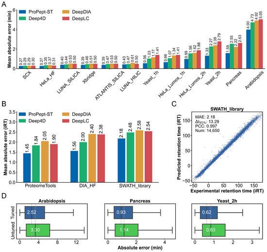 Across all 15 datasets, ProPept-ST consistently outperformed extant models in terms of mean absolute error (MAE) (Figure 1A,B) and (Supplementary Figure S1). Importantly, the HeLa HF dataset, constructed using 15-min short gradients, posed a potential challenge due to reduced resolution and peak capacity, potentially affecting the predictive accuracy of apex peptide RT [38]. Despite these challenges, ProPept-ST exhibited superior performance compared to the leading DeepLC model on the HeLa HF dataset, achieving MAE values of 0.27 vs. 0.31 and values of 1.46 vs. 1.62. In the case of the SWATH library test set, the predicted iRT values demonstrated high precision, with a PCC of 0.997 (Figure 1C).