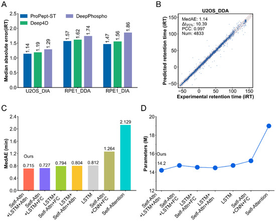 ProPept-ST assesses the performance of predicting phosphorylated peptide RT and the ablation experiment on the ProPept-ST model. (A) Comparison of the prediction accuracy of various models for phosphorylated peptide RT based on the median absolute error on different datasets. (B) Scatter plot comparing ProPept-ST-predicted iRT values with experimentally observed iRT values for the U2OS_DDA dataset. (C) Median absolute error of RT prediction by ProPept-ST and six other models on the benchmark dataset H4 DDAp. (D) Parameter count comparison between ProPept-ST and six other models.