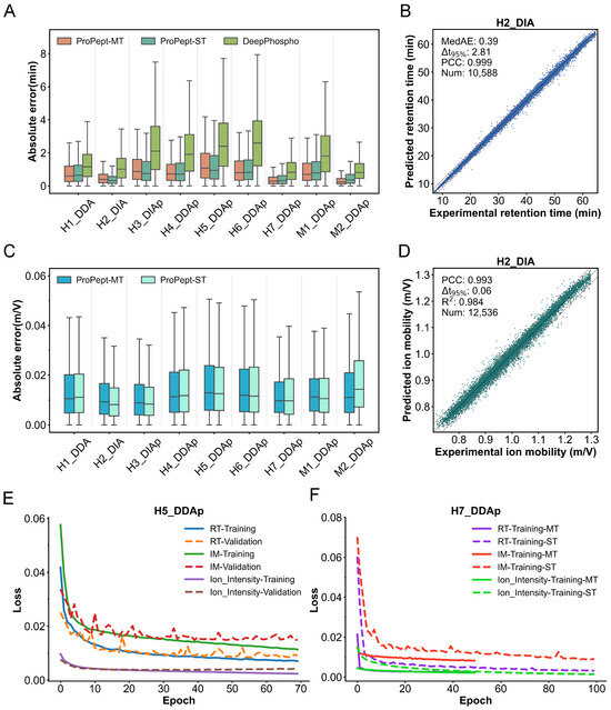 ProPept-MT’s performance in predicting RT and IM, as well as the loss curves for training three tasks on specific datasets. (A) Distribution of absolute errors for predicting RT on benchmark datasets for each model. (B,D) Scatter plots showing ProPept-MT’s predictions of RT (B) and IM (D) on the H2 DIA test set. (C) Distribution of absolute errors for predicting IM on benchmark datasets for ProPept-MT and ProPept-ST. (E) Loss curves for training and validation of the three tasks on dataset H5 DDAp for ProPept-MT. (F) On the H7 DDAp training set, the loss curves of ProPept-ST retrained on three tasks and the fine-tuned loss curves of ProPept-MT.