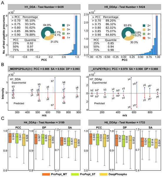 Performance of ProPept-MT in predicting fragment ion intensity. (A) Histogram distribution of PCC for each peptide on the H1 DDA and H5 DDAp test sets. (B) Mirror plot showing the experimental and predicted values of fragment ion intensities for two specific peptides (unmodified peptide and phosphopeptide). (C) Box plots showing the distribution of PCC, DP, and SA for ProPept-MT on the H1 DDA and H6 DDAp test sets.