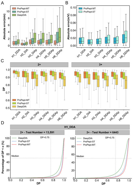 To ensure consistent comparisons, datasets were initially filtered to exclude those with insufficient data volume, which could potentially affect the performance of single-task training in DeepDIA. For result evaluation, the primary metrics outlined in the DeepDIA study are followed, with PCC and median DP being utilized as key evaluation metrics for RT and ion intensity, respectively. Concerning RT prediction, ProPept-MT outperforms both ProPept-ST and DeepDIA in PCC on five datasets, achieving 0.987 compared to 0.971 and 0.958 on the H6 DDA test set (Table 3). Figure 5A visualizes the distribution of absolute errors for RT prediction across six datasets, showing that ProPept-MT’s MedAE consistently exceeds that of DeepDIA and ProPept-ST on five datasets.