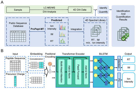 In recent years, artificial intelligence has made considerable strides and found widespread application in the biomedical field, spanning medical image analysis [6,7,8], bioinformatics [9,10], disease diagnosis and treatment [11,12], and proteomics [13,14,15,16,17]. In proteomics research, we have reported several deep learning methods applicable to DIA data analysis, such as Dear-DIAXMBD [13], an untargeted analysis method for directly analyzing DIA data; AttnPep [14], used for rescoring peptide-spectra match scores; and SeFilterDIA [15], designed to automatically identify high-confidence peptides. Deep learning approaches can also be leveraged to generate in silico libraries by predicting the fragment ion intensity, RT, and IM of given peptide sequences [18]. Noteworthy examples include DeepMass:Prism [19], Prosit [20], DeepDIA [21], pDeep [22], DeepPhospho [23], Guan et al. [24], MS2CNN [25], Predfull [26], and Deep4D [27]. Among these, DeepDIA employs a model based on bidirectional long short-term memory networks (BiLSTM) [28], encoding each amino acid into a 20-dimensional one-hot vector representing the 20 amino acids. Deep4D utilizes a deep learning model based on the self-attention [29] module, encoding each amino acid into a 23-dimensional one-hot vector, with an initial 20 dimensions representing the 20 amino acids and the subsequent three dimensions representing acetylation, oxidation, and phosphorylation modifications. Another example, DeepPhospho, also harnesses a model based on the self-attention module and exhibits outstanding performance in predicting phosphorylated peptide RT.