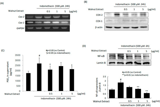 With indomethacin administration, the gastric cells showed significant increases in cox-2 mRNA expression (Figure 1A). However, in the presence of the walnut extracts, the expression of cox-2 mRNA was significantly decreased. These results were noted in the consequent Western blot of COX-2 (Figure 1B). Interestingly, in this experiment, although COX-1 has been known as constitutive, as shown in Figure 1A,B, the WPEs increased either the COX-1 mRNA or its expression, signifying that the WPEs significantly regulated the expression of COX. These changes in COX led to significant increases in PGE2 with indomethacin administration. However, the WPEs significantly decreased the PGE2 levels. All these changes were significantly correlated with the repression of NF-κB and significant decreases in NF-κB nuclear translocation (Figure 1D).