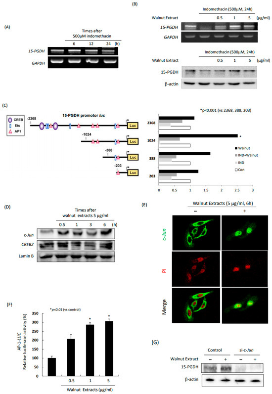 As noted in the COX regulation with WPEs (Figure 1) that the changes in the COX expression and PGE2 decrease, we proceeded to measure the changes in 15-PGDH. Indeed, 15-PGDH has been known to reflect the PG levels. As shown in Figure 2A, indomethacin alone significantly decreased in the 15-PGDH mRNA, but, in the presence of the WPEs, the cancelled expression of the 15-PGDH mRNA was significantly restored. These findings in the 15-PGDH mRNA were repeated with the Western blot for 15-PGDH. As noted in Figure 2B, the indomethacin administration significantly decreased 15-PGDH, but not in the presence of the WPEs. Overall, the WPEs significantly afforded anti-inflammatory action through either COX-2 inhibition, COX-1 increases, or the preservation of 15-PGDH. In order to know the promoter regulation of 15-PGDH with WPEs, we conducted a promoter assay. As shown in Figure 2C, a promoter containing -1024 showed significant increases in promoter activity in the presence of the WPEs (p < 0.001). Looking at -1024 to 1 of 15-PGDH, there was one Ets and three binding sites of AP-1. Therefore, when we measured the c-Jun expression with walnut, the expression of c-Jun was significantly increased as time passed after the WPE administration (Figure 2D), the findings of which were further confirmed by the confocal imaging of c-Jun (Figure 2E) or AP-1 luciferase activities (Figure 2F), consistent with the findings of the Western blot of c-Jun. When we knocked down c-Jun with siRNA, as shown in Figure 2G, in spite of the WPE administration, 15-PGDH was not increased.