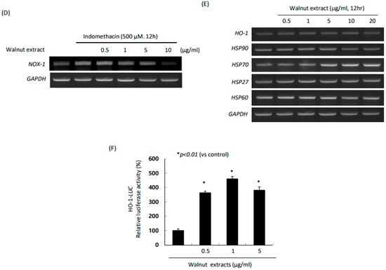 In order to verify the antioxidative capacity of the WPEs, we performed a DPPH reduction assay. As shown in Figure 3A, the antioxidative actions of the WPEs were shown from the concentration higher than 5 μg/mL, which was verified with a flow cytometry analysis (p < 0.01, Figure 3B). Among the antioxidative enzymes, the WPEs exerted significantly increased expressions of HO-1, PRX2, and GPX2 (p < 0.01, Figure 3C). The significantly increased expression of NOX-1 with indomethacin was significantly attenuated with the WPE administration (Figure 3D). In terms of the RT-PCR for HO-1 and several HSP mRNAs, the walnut increased the HO-1 mRNA as well as HSP70 and HSP27 mRNAs, after which we measured the HO-1 luciferase activities. As shown in Figure 3D, the WPEs significantly increased HO-1 luciferase (p < 0.01). Conclusively, walnut, although not a professional antioxidant, induced significant cytoprotection against indomethacin via antioxidative actions.