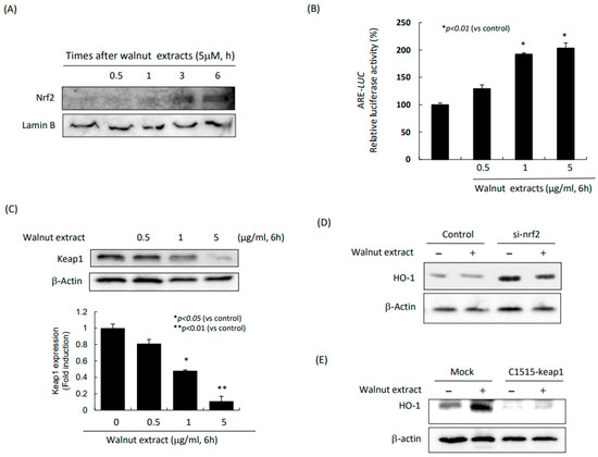 Since HO-1 is a significant antioxidative gene and walnut rescued the stomach from indomethacin via HO-1, we established the hypothesis that walnut can activate Nrf-2 to induce HO-1. As shown in Figure 4A, Nrf2 was significantly increased with the increasing time of the 5 μM WPE. In a similar setting, we measured the antioxidant response element (ARE) luciferase activities and found that walnut significantly increased the ARE activities (p < 0.01, Figure 4B). Since Nrf2 is activated after inactivating keap1, we also measured the expression of keap1 with an increasing dose of WPE. As noted in Figure 4C, the significantly decreased expression of Nrf2-inactivated Keap1 (p < 0.01). The findings included that, when Nrf2 was knocked down, the walnut administration did not provoke HO-1 (Figure 4D), and also, when keap1 was knocked down, the WPE administration did not result in HO-1 induction (Figure 4E), which consistently signified that the antioxidative and cytoprotective actions of the WPEs were through HO-1 transcribed with Nrf2.