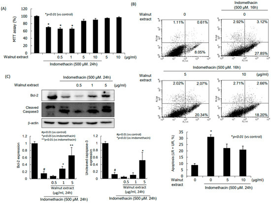 Indomethacin alone led to significant cytotoxicity assessed via the MTT assay (Figure 5A), but the co-administration of indomethacin and WPEs at higher than 5 mg/mL concentrations significantly ameliorated the indomethacin cytotoxicity. These MTT results were further verified with flow cytometry (Figure 5B). As an explanation regarding how walnut ameliorated the indomethacin-induced cytotoxicity, a significantly increased expression of Bcl-2 was found (p < 0.001, Figure 5C).