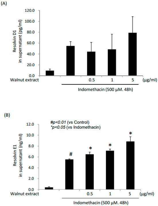 Since the features of the anti-inflammatory and cytoprotective actions of n-3 fatty acid-containing substances are through the increased resolving action of inflammation, under the hypothesis that walnuts plentiful in n-3 polyunsaturated fatty acids (PUFAs) can increase RvE1, we measured RvD1 and RvE1, respectively. As shown in Figure 6B, significantly increased levels of RvE1 were noted in accordance with an increasing dose of the WPE even under the indomethacin challenge. However, no significant changes were noted in RvD1 (Figure 6A).
